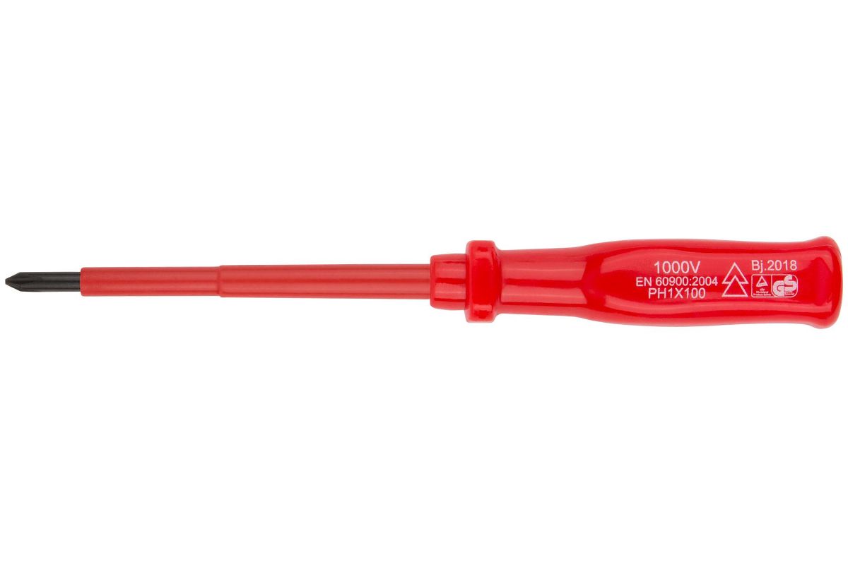 Изолированная отвертка CrV 1000V PH 1х100 мм подходит для монтажа и работ с напряжением до 1000V.