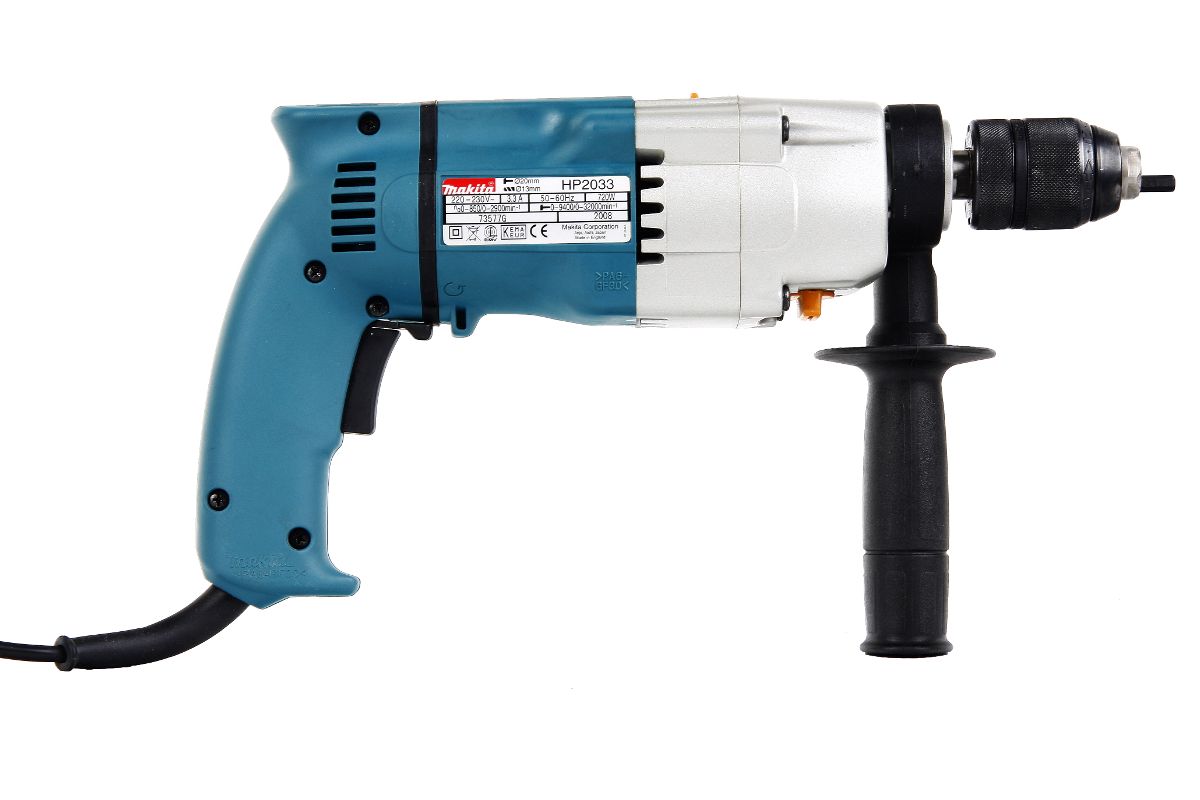 Мощная ударная дрель MAKITA HP2033 оборудована электрическим двигателем на 720 Вт. Инструмент работает в двух скоростных режимах. Максимальное число оборотов составляет 850 или 2900 в мин. В каждом режиме скорость регулируется с помощью пусковой кнопки.